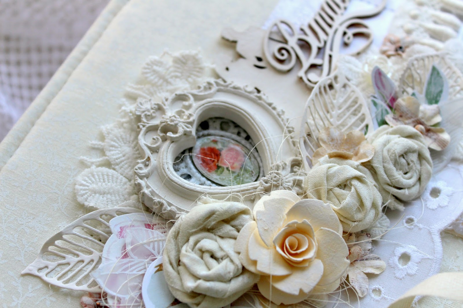 И давайте немного поближе посмотрим на декор. Книжка обтянута такой же тканью,как и крышка коробочки.Очень красивую резную чиповую рамочку украшает букет цветов